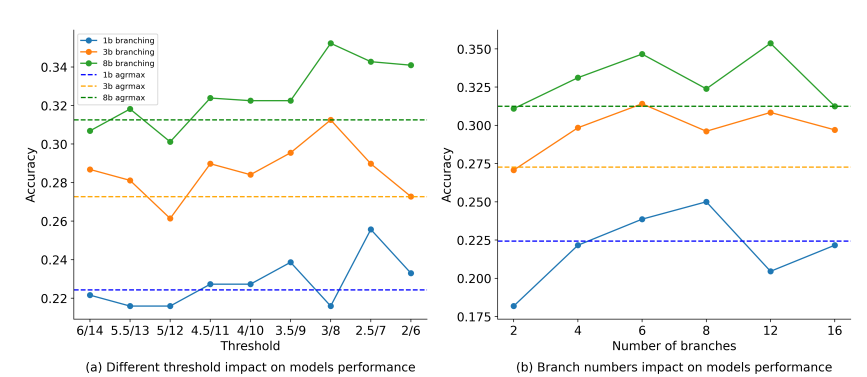 그림 3(b)는 브랜치 수 K 변화에 따른 성능으로, 1B 모델은 브랜치 수를 8까지 늘리면 성능이 증가하다가 지나치게 많아지면 오히려 하락했다. 3B 모델은 6~8개 범위에서 안정적이었고 지나친 브랜칭이 오히려 효용을 떨어뜨렸습다. 따라서 적절히 많은 브랜치를 생성해야 탐색 효과가 나타나며, 과도한 브랜치는 오히려 분기 간소화나 시간 낭비로 이어지므로 임계값과 브랜치 수를 적절히 조절해 분기 빈도와 수를 최적화하는 것이 중요하다.