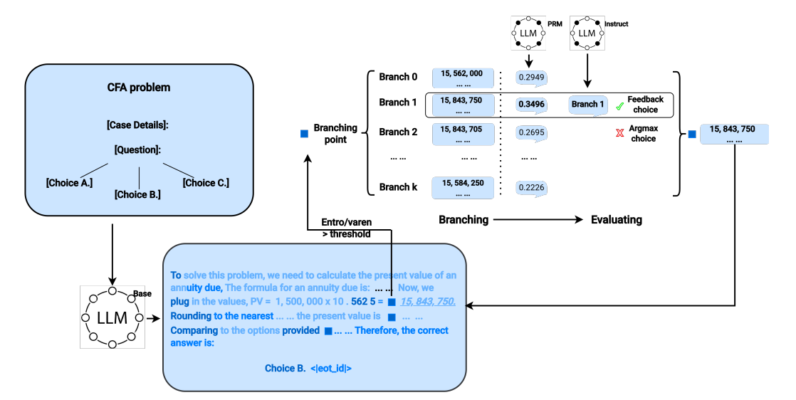 - 브랜치 평가와 선택 (Branch Evaluation): 모든 브랜치가 완성되면 피드백 모델을 통해 각 브랜치의 품질을 평가한다. 이 피드백 모델로는 큰 LLM(예: Llama-3.3-70B-Instruct)이나 프로세스 리워드 모델(LLama-3.1-8B-PRM)이 사용된다. 원 질문과 브랜치 내용 전체를 입력하면, 피드백 모델이 논리 일관성과 정확성을 기준으로 점수를 매기거나 선호도를 계산한다. 가장 높은 점수를 받은 브랜치 하나를 선택하여 이후 생성 과정의 시작점으로 삼으며 한 번에 한 번만 분기를 허용해 무한 분기를 방지하고, 선택된 브랜치에서 다시 불확실성이 커지는 시점에 새로운 분기를 생성할 수 있다.