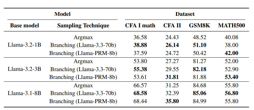 표 1에서 볼 수 있듯이, 모든 벤치마크에서 분기 디코딩이 성능을 꾸준히 향상시켰다. Llama-3.2-1B 모델은 Argmax(24.43%)에서 분기(26.14%)로 CFA II 정답률이 약 1.7%p 상승했고, Llama-3.1-8B는 Argmax(31.25%)에서 분기(35.80%)로 약 4.6%p 올랐다. 일반적으로 큰 모델일수록 분기에서 더 큰 향상을 보였는데, 이는 더 많은 브랜치 후보를 만들어 풍부한 선택지를 확보했기 때문으로 분석된다. 작은 모델도 일관되게 개선되어, 제안 기법이 모든 규모에서 유효함을 확인했다.