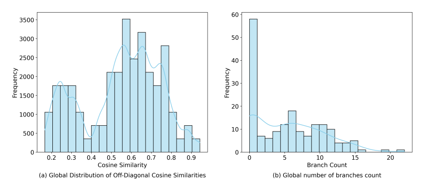 그림 4(a)에서 알 수 있듯, 각 분기점에서 생성된 브랜치 간 코사인 유사도는 대부분 0.5–0.7 사이로 나타났.