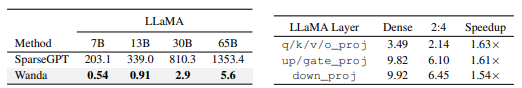 - Wanda는 한 레이어의 metric 계산 시간이 SparseGPT 대비 수십 배 빠름.