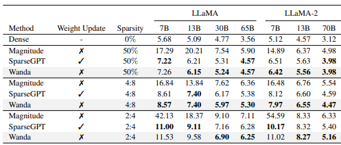 - SparseGPT는 weight update 필요하지만 Wanda는 거의 개선 X