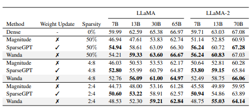 - SparseGPT → 여전히 가장 높은 성능이지만 Wanda와 차이가 작음
