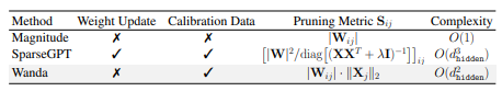 ⇒ Pruning by Weighs and activations (Wanda) 기법 제시- output 별로 input activation과 곱해진 가중치 크기가 가장 작은 것들을 pruning