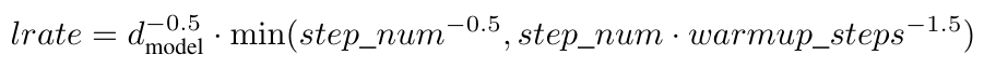 - warmup_steps 훈련 단계에서는 learning rate를 선형적으로 증가시키고, 그 이후에는 step number의 역제곱근에 비례하여 감소 (warmup_steps = 4000)