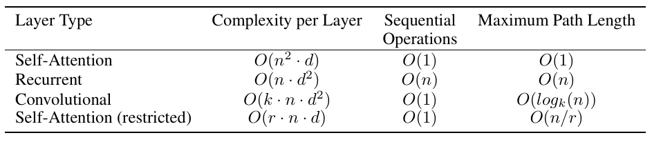 → (Complexity per Layer) Self-Attention layer는 recurrent layer보다 빨리 걸림: sequence 길이인 n이 representation 차원 d보다 작을 경우 (word-piece나 byte-pair와 같은 machine translation SOTA에서 많이 발생)