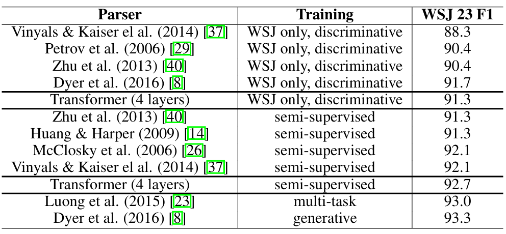 → RNN sequence-to-sequence model[37]과 달리 WSJ training set에서만 훈련할 때에도 Transformer는 Berkel Parser[29]의 성능을 능가함