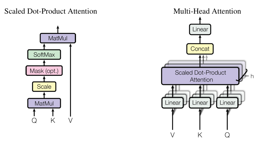 - $d_{k}$ 의 값이 커지면 dot product 값이 매우 커져 softmax 함수가 매우 작은 값으로 밀려나가는 것을 막기 위해 dot product를 $\sqrt{d_{k}}$ 로 나누어 크기 조정